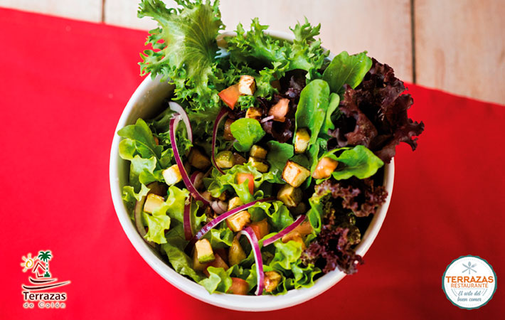 (verdes de estación, cubitos de pollo empanados, croutones de pan de campo y chip de queso parmesano) como plato principal