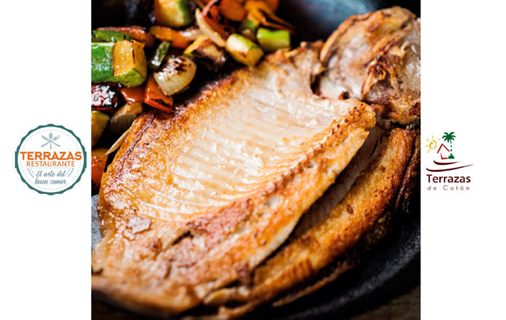 Boga grillada acompañada con vegetales asados o papas y batatas de la zona