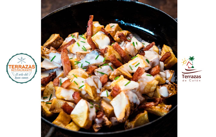 (Papas rústicas doradas con panceta crocante y salsa de tres quesos, gratinadas con parmesano)